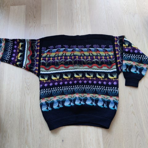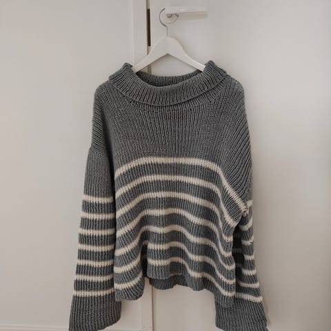 Kaislakerttu Lehtovaaran mallin mukaan Pirkanmaan Kotityön langoilla neulottu pusero. Kaikai-mitta venyttämättä noin 52 cm, niskahelma noin 58 cm.