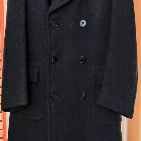 Päällinen : Villa 45 % / polyester 55 % - Vuori: asetaattia. Väri: Musta - Vuori: Vaalea/tummaraitainen. Ei kulumia, vain muutama kerta käytetty. Takin pituus 100 cm. Koko 50. Kaksi povitaskua vetoketjulla. Hieno takki.