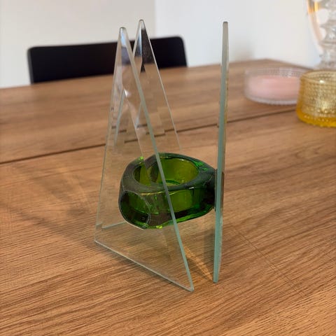 Vihreä lasinen maljakko. Korkeus noin 25cm, suuaukko noin 12cm.