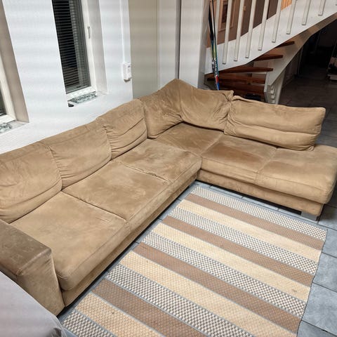 Istuinosien ja selkätyynyjen kankaat irrotettavat ja konepestävät. Kankaat laadukkaat ja täysin ehjät. Myös täytteet ehjät mutta ehkä hieman muuttaneet muotoaan vuosien istumisesta.