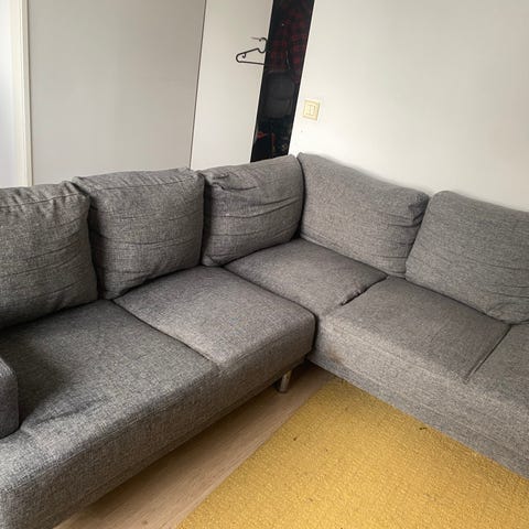 Annetaan n. 7 vuotta vanha harmaa kankainen divaanisohva.