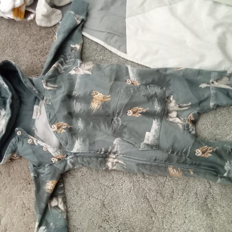 Newbien puuvillainen vauvan haalari koko 62, valkoinen, beige ja vihreä kuosi jossa lampaita ja lehtiä