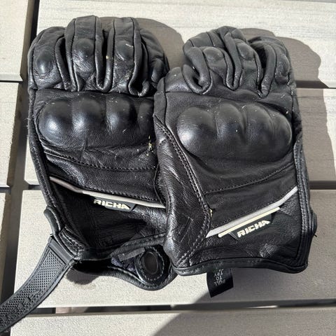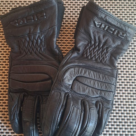 Richa ajohanskat mustaa nahkaa. Hanskoissa on pitkät varret ja tarrakiinnitys ranteessa. Sormissa ja rystysissä on vahvistuksia ja pehmusteita moottoripyöräilyyn tai muuhun ajoon. Soveltuvat aikuiselle käyttäjälle.