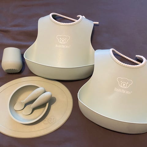 Ezpz-ruokailusetti ja BabyBjörn-ruokalappu