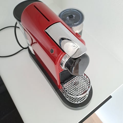 Nespresso kapselikahvikone erillisellä sähköisellä maitovaahdottimella. Väri musta / metalli. Malli ilmeisesti vanhempaa citiz-mallia, toimii moitteettomasti ja on tehopesty.