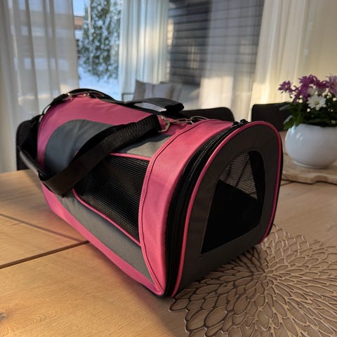 Kankainen lemmikkikuljetuslaukku pienelle koiralle tai kissalle. Laukussa on vaaleanpunaiset sivut ja mustat vahvikkeet sekä pohja. Useilla sivuilla on verkkopaneelit ilmanvaihtoa ja näkyvyyttä varten. Edessä ja sivuilla on vetoketjulla avattavat aukot, jotka helpottavat lemmikin sisään ja ulos ottamista. Yläosassa on kantokahvat ja olkahihnat kantamista varten. Käyttömateriaali on kangasta ja verkkokangasta.