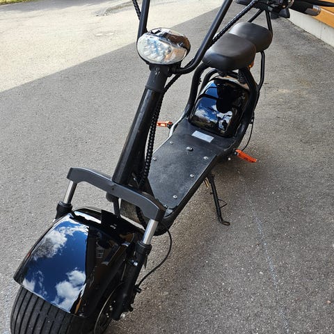 Kolmipyöräinen skootteri sähkö, Kaksi 350 V:n moottoria ja 36 V:n 12 Ah:n akku. Se pärjää hyvin maastossa ja ylämäissä. Mukana on myös laturi, etujarru ja akkulukko kahdella avaimella.