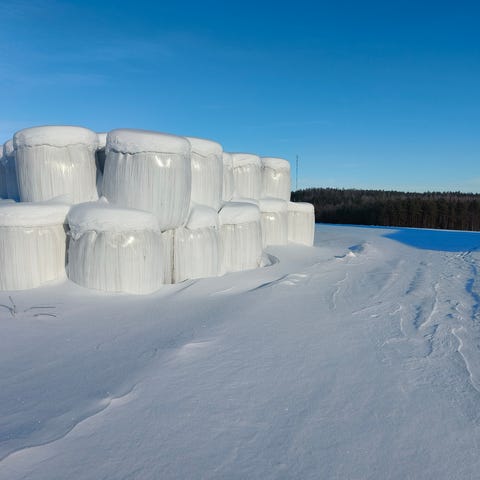 Viime kesäistä esikuivattua heinää pyöröpaaleissa, muovitettuna.