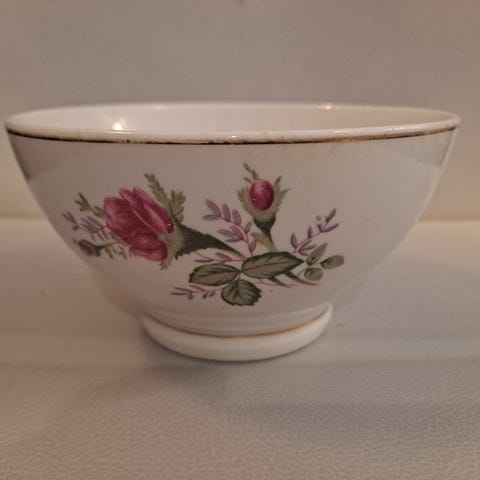 Kulho, valkoinen kukkakuvioilla. Halkaisija 23cm, korkeus 6cm. Hyvä tarjoiluastia tai esim. Hedelmille. Valmistettu tsekkoslovakiassa. Hienoa böömiläistä posliinia.