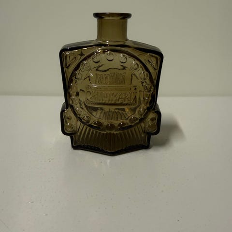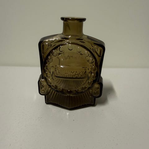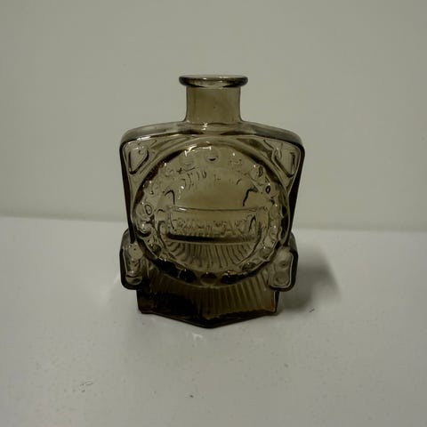 Kaunis ruskea veturipullo. Toisen puolen alakulmassa karheutta, näkyy pohjakuvassa, ei näy muuten.