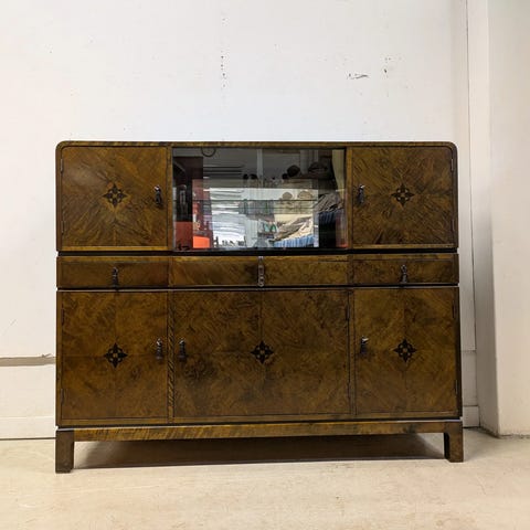 Kuvan upea ja laadukas Hepplewhite vitriini myytävänä. Kunto hyvä. Yläosa pois nostettava. Avaimet tallessa. Vasemman yläoven lukko korjattu, avain ei poistu lukitus asennossa. Muut lukot toimivat normaalisti. Sisällä kaksi lasihyllyä, jotka korkeussäädettävissä. Sisusta siisti eikä ole hajuja.