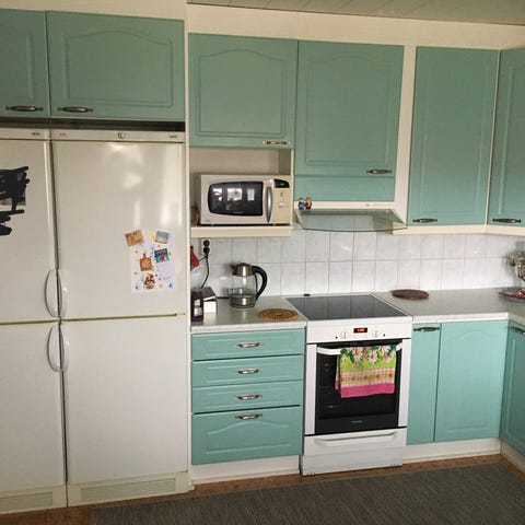 Annetaan 40v vanha Nyystölän Puutyön valmistama keittiö. Kulumaa on ja osa vetimistä irronnut. Saa tulla katsomaan ja itse purkamaan.