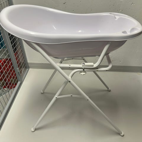 Vauvankylpyamme jalustalla. Amme on harmaan värinen ja jalusta valkoinen. Korkea jalusta helpottaa vauvan kylvettämistä. Hyväkuntoinen