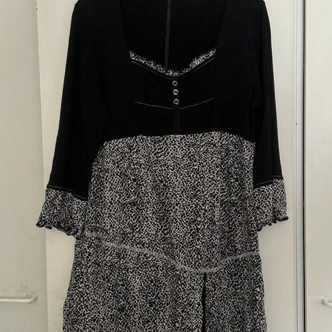 Tunika naisille, koko one size. Materiaalina puuvilla. Vaatteessa on sininen väri, kukkakuvioita ja pitsiyksityiskohtia helmassa. Hihassa on nappikiinnitteinen rypytys. Sopii käytettäväksi esimerkiksi arkitunikana tai kevyenä yläosana housujen tai legginsien kanssa.