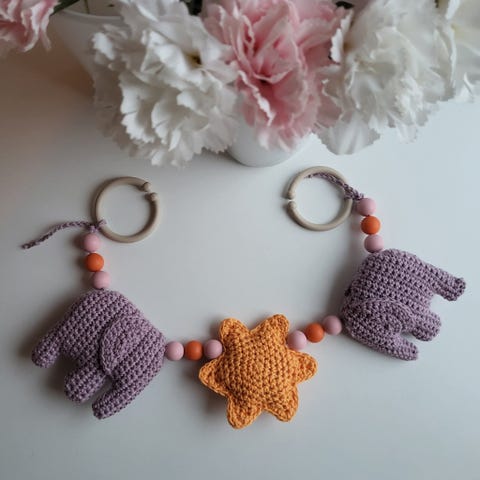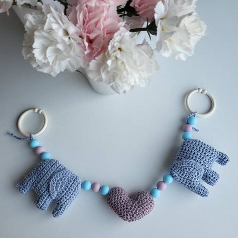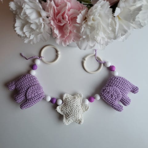 virkattu vaunulelu, norsu vaunulelu, kaukalolelu, käsintehty vauvalelu, vauvalahja, virkattu norsu, baby shower -lahja, käsityö
