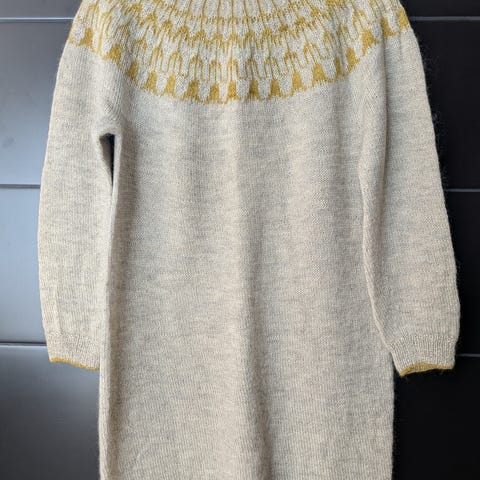 Käsin neulottu kuvioneulemekko. Vähän pidetty. Hyvässä kunnossa. Koko pituus 100cm, kai-kai 45cm, hiha kainalosta ranteeseen 42cm