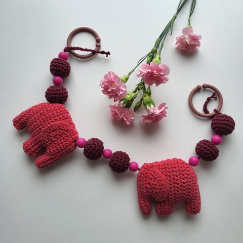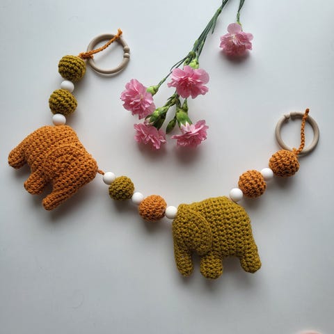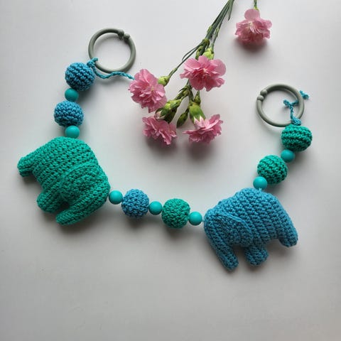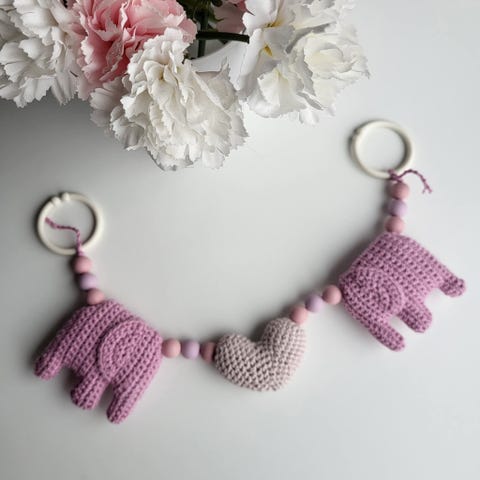 virkattu vaunulelu, norsu vaunulelu, kaukalolelu, käsintehty vauvalelu, vauvalahja, virkattu norsu, baby shower -lahja, käsityö