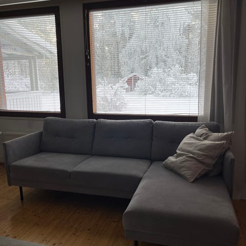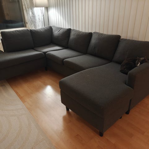 Tästäpä seuraavalle iso mukava löhösohva. Käsinojan koira purrut rikki, meillä ollut viltti päällä, mutta taitava korjaa! Päälliset ovat irroitettavat ja ei oo kauan ku on pesty tekstiilipesurilla. Meidän taloudessa ei lemmikkejä.