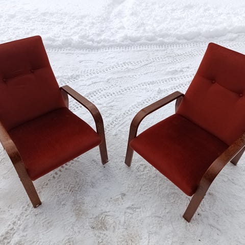 Tuollaiset lepotuolit myydään, 3kpl. Suunnittelija ei tiedossa, Kukkapurolla on noita remmejä ollut käytössä mutta en tiedä kenen suunnittelemat nämä on. Päällystystä vaativat, muuten tukevat ja ehkä hieman mökki henkiset tuolit. Takka huoneeseenkin sopivat. Kaikki 3 yhteensä 60€ noudettuna Saukkolasta.