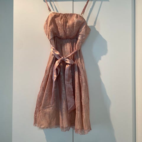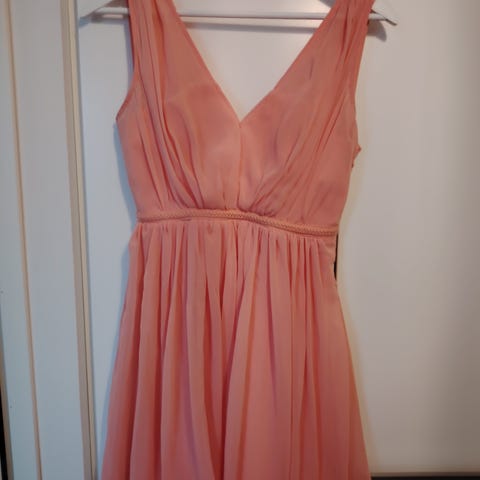 Käytetty kerran. Säädettävät olkaimet, jotka saa halutessaan pois. Sivussa piilovetoketju ja helmassa kuminauha.