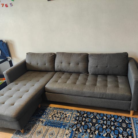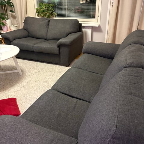 Hyvässä kunnossa oleva harmaa kangassohva. Selkänojan tyynyt, sekä istuintyynyt on irtonaiset. Pysyy ryhdikkäästi paikallaan. Kuvan koristetyynyt ei tule mukana.