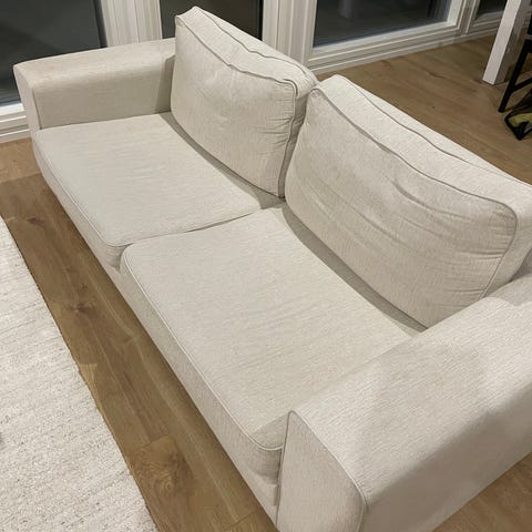 Käsinojassa ja sohvan alareunassa pienet reiät. Näkyy kuvissa.