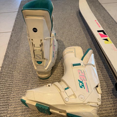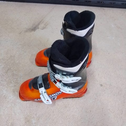 Salomon SX Team laskettelumonot. Väri musta keltaisilla yksityiskohdilla. Monot ovat takaklipsilliset ja niissä on säädettävät kiinnityshihnat. Pohjassa kuminen keltainen kävelypohja, jossa merkintä 3°. Soveltuvat lasketteluun rinteissä. Vaihto 2 Fazerin siniseen suklaa levyyn
