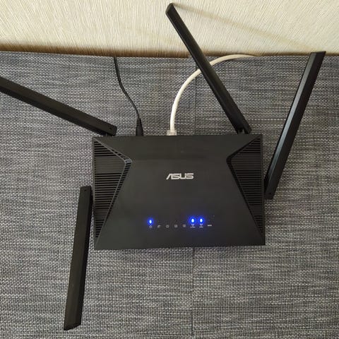Mukana virtajohto, pakkaus ja 1kpl hdmi johtoa, jolla reitittimen voi yhdistää.