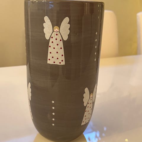Enkeli ruukku, kullanvärinen. Käytetty kynttilä alustana ja kynttilä on sulanut sisälle. Siistikuntoinen, korkeus n. 6cm, leveys n. 7,6cm.