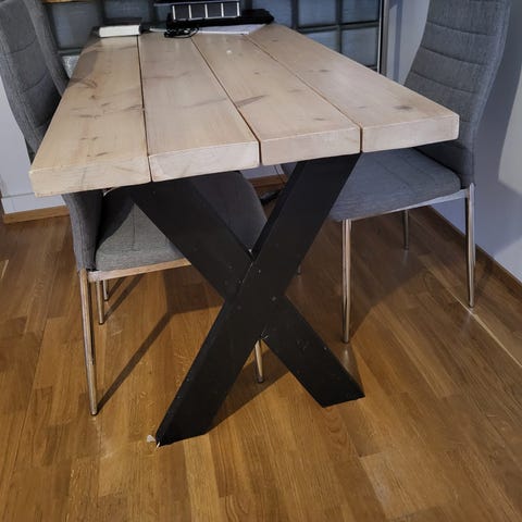 Jykevä ruokapöytä. Pinnassa näkyy käytön jälkiä, näkyy kuvissa.