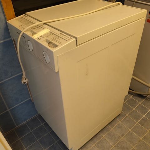 Whirlpool päältä täytettävä pesukone. Pesukoneessa on ylhäältä avattava kansi ja pystyrumpu, joka helpottaa pyykin lisäämistä ja poistamista ahtaammissakin tiloissa. Ohjauspaneelissa on valintanuppi ja painikkeet eri pesuohjelmille ja lisäasetuksille. Laitteessa on vesiliitäntä ja poistoletku takana. Sopii tavalliseen kotitalouskäyttöön pyykin pesuun. Toimiva, mutta tarpeeton.
