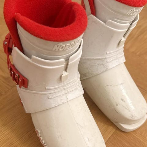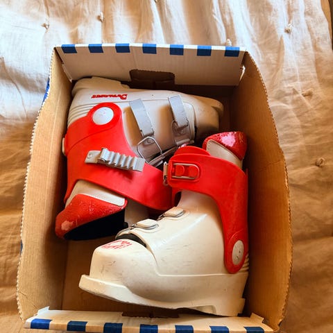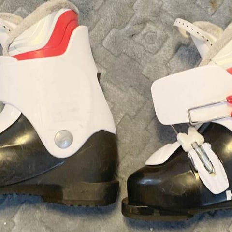 Lasten laskettelumonot. Väriltään ne ovat mustat punaisilla yksityiskohdilla ja punaisella sisäosalla. Kokoa 31. Toimivat normaalisti suksissa.