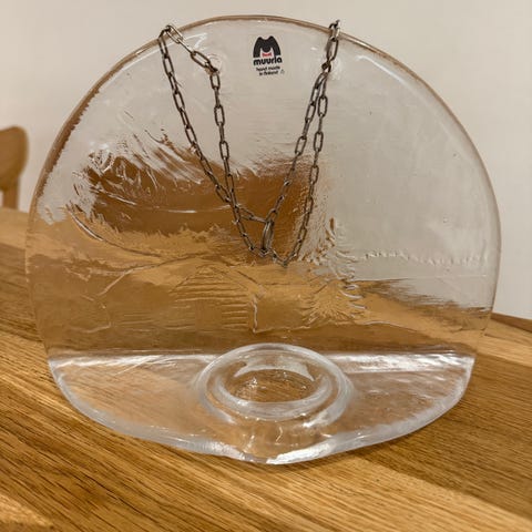 Uudenveroinen,ehjä ja siisti tuikku/kynttilä alusta. Ollut vitriinissä koristeena. Reunassa tarra. Halkaisija 27cm,korkeus 9cm.