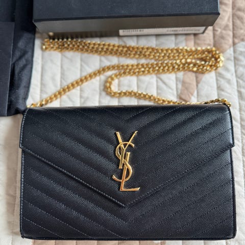 Tämä elegantti Saint Laurent Kate Tassel Clutch on valmistettu mustasta nahasta ja viimeistelty kultaisilla metalliosilla!