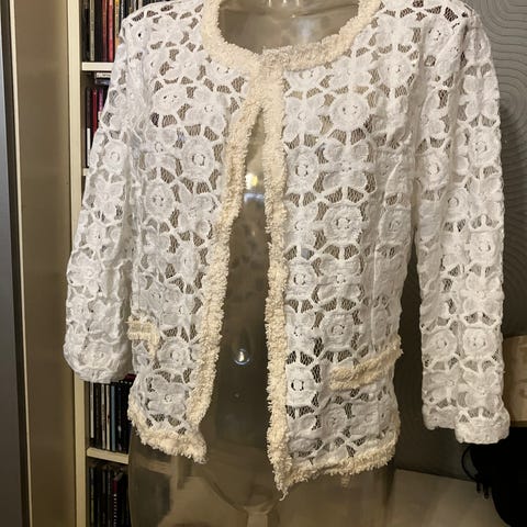 Puserossa on vuorikangas etuosan yläosassa. Paita on tyylikäs ja kangas hieman joustavaa, takaosasta ja hihoissa ei ole vuorikangasta. Kuvissa näkyy että millanen pusero on kun puseron alla on punainen toppi. Puseron mittoja: Kainalo-kainalo on 47 cm puseron pituus on 57 cm, hihan pituus on 58,5 cm.