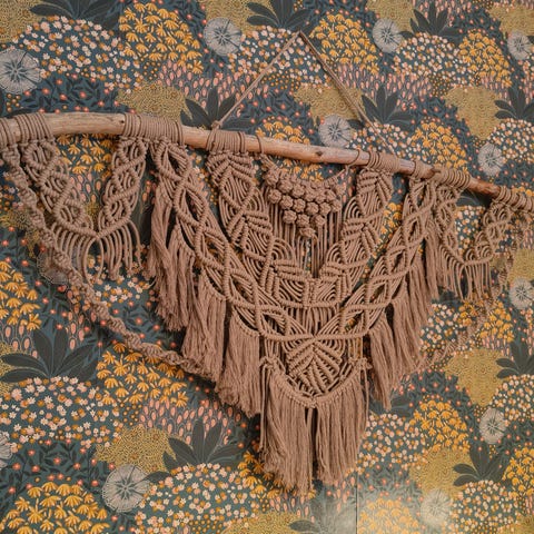 Beige ontelokuteesta solmittu makramee kattovalaisin ja seinävaate.