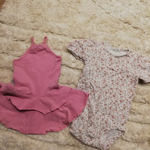Blaa bodymekko, uudenveroinen. Pinkki, koirakuvioita. Koko 80cm