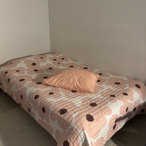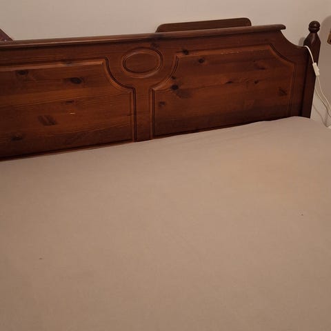 120x200cm Jysk sänky runkopatjalla. Sängyssä on tummaverhoiltu runko ja vaalea patjan pinta.