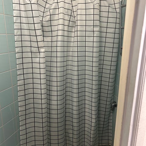 Suihkuverho, jossa trooppisen rannan ja palmujen kuviointi. Verho kiinnitetään yläreunasta renkailla suihkuverhotankoon.