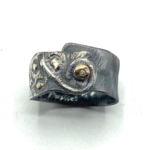 Tämä sormus on rajoitetun painoksen "Mosaic"-kokoelman suunniteltu ja valmistettu Alexandra Steinforthin (Ale jewels) toimesta, koru- ja taidealalla lisensoitu. Kyseessä on täysin käsityönä tehty ja käsin veistetty kappale, joka yhdistää teksturoidun hopean luonnollisen helmen kanssa toisen osan 18 karaatin kultaisilla yksityiskohdilla. Se on nykyaikainen muotoilu, ihanteellinen kaikille tilaisuuksille ja artisteihin ja jalokivien ystäville — ainutlaatuinen ja yksittäinen teos. Etusivun leveys on maksimissaan 11 mm, ja sormus on säädettävä peruskoon ollessa 17."}Se lähetetään todistettuna ja vakuutettuna seurantanumeron kanssa, lahjarasian sekä taiteilijan tietojen kera, jotta se saapuu vastaanottajalle turvallisesti.