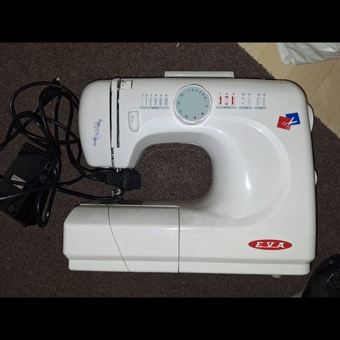 Tässä uudenveroinen ompelukone, takuu voimassa, paperit on.