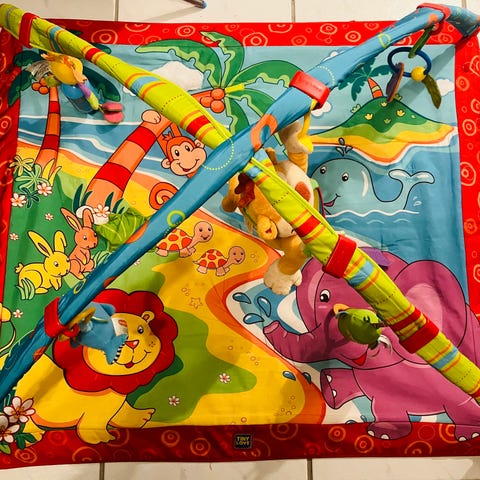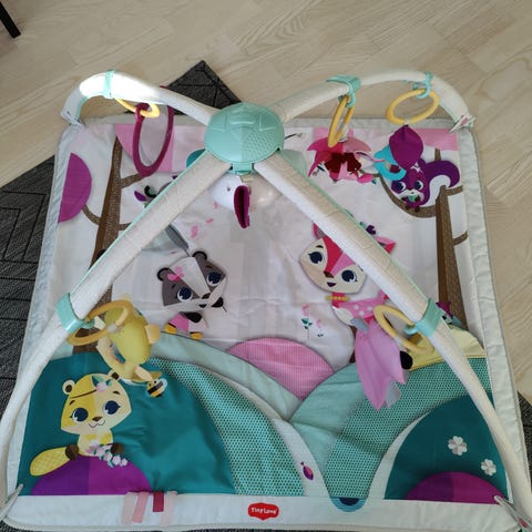 Tiny Love merkin Into the forest deluxe leikkimatto vauvalle. Hyvä ja siisti kunto, pientä naarmuuntumista peilissä, huopakankaassa vähän nukkaa ja kaksi hapsua rispaantunut. Ei tahroja ja juuri pesty seuraavalle vauvalle. Linnussa monta eri sävelmää ja valo, jota vauvan on kiva katsella. Ollut superkiva leikkimatto ensimmäiset kuukaudet vauvan viihdyttämiseen ja liikkumisen motivoimiseen.
