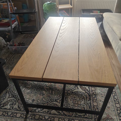 Annetaan valkoinen sohvapöytä. Pinnassa pieniä käytön jälkiä. Mieluusti nouto Perkkaalta.