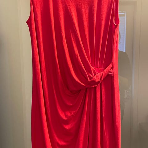 Sisters pointin punainen mekko mustilla yksityiskohdilla. Mekossa on ohuet olkaimet ja piilovetoketju vasemmalla kyljellä.