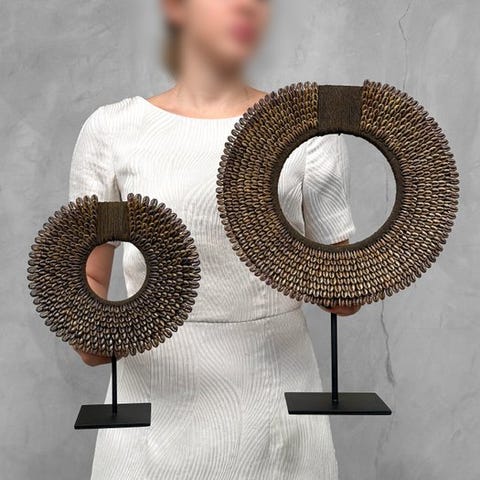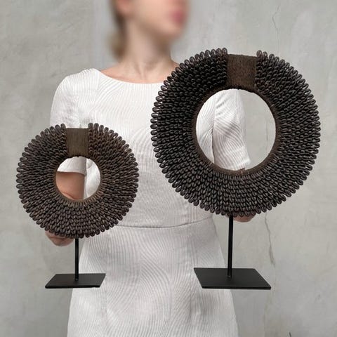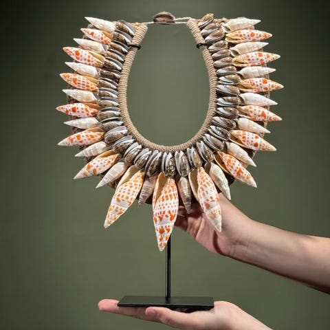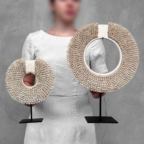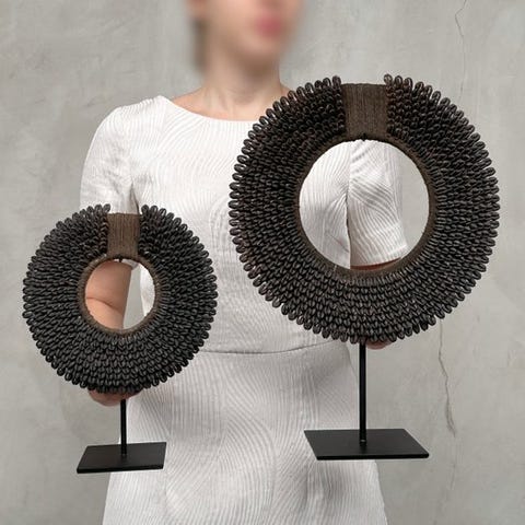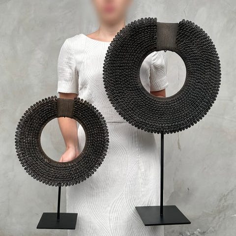 Heimojen kaulakoruja, jotka on valmistettu nassa-kalvoista. TOLAÏ-heimo, Uusi Britannia, Papua-Uusi-Guinea. Kaulakorut sisältävät satoja pieniä nassa-kalvoja. Merkittävää on, että lähes kaikki ovat saman kokoisia, minkä vuoksi niissä on erittäin sileä primitiivinen muotoilu.Arvioidut mitat mukaan lukien jalustat.Kaulakoru 1: Korkeus 42 cm, leveys 30 cm.Kaulakoru 2: Korkeus 28 cm, leveys 20 cmVASTUUNRAJOITUKSET:Yksi tai useampi kuva tarjoaa tyylitellyn esityksen vastaavasta tuotteesta. Tarkkojen tietojen saamiseksi myytävästä tuotteesta viittaa muihin kuviin. Ei mitään tyylitellyssä valokuvassa ole mukana myynnissä.Paino, joka mainitaan, sisältää pakkausmateriaalin.LähetysKohde lähetetään seurantanumerolla DHL Parcelin, DPD:n tai postNlin kautta. Seuranta päivittyy Catawiki-luettelossasi, kun pakettisi on jätetty postiin.Ole hyvä ja tarkista säännöllisesti välttääksesi pakettisi palautumisen meille, jolloin ostaja vastaa toisen lähetyksen toimituskuluista.Seurantaan Espanjaan ja Portugaliin käytä tätä linkkiä ja lisää Catawiki-erästäsi saatu seurantanumero.https://clientesparcel.dhl.es/LiveTracking/HomeEMME YHDISTÄ TOIMITUKSIA!!!- Jos sinulla on kysyttävää paketistasi, ota yhteyttä meihin Catawiki-viestipalvelun kautta. Yritämme vastata kolmen työpäivän kuluessa.