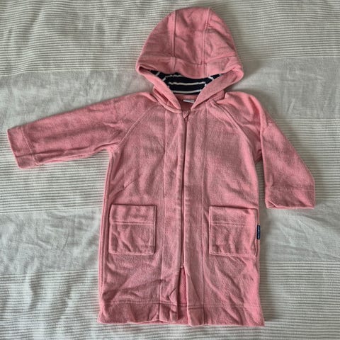 Uudenveroiset kylpytakit. Vasemmalla koko 86/92 ja oikealla 120 cm. Hinta 5€ kpl. Eläimetön ja savuton koti. Löytyy Helsingistä Pihlajistosta mutta postitan myös.