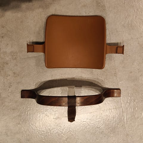 Stokke syöttötuolin muovinen etukaari ja selkänoja. Väri valkoinen. Etukaaressa kulumaa, joka näkyy kuvassa 3.