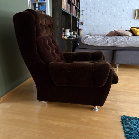 Sininen nojatuoli. Siisti ja ehjä, päälliset juuri pesty. Nouto Hervannasta.