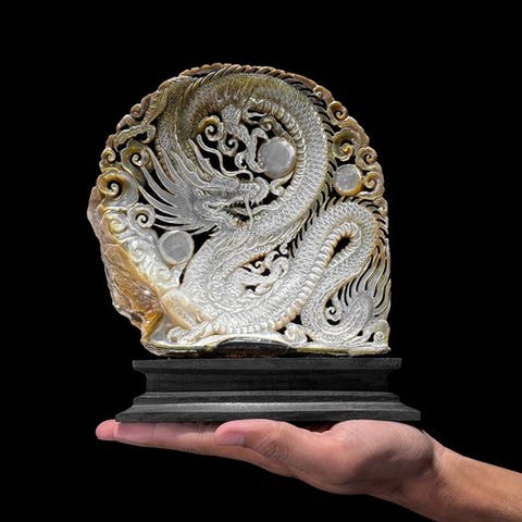 Täysin kaiverrettu, suuri äidinhelmen kuori, erittäin yksityiskohtainen. Kaiverrus kuoreen esittää ihmisen kallo. Kuori on kaiverrettu balilaisen käsityöläisen toimesta, joka hallitsee kaiverrustaidon. Tämä artesaani on yksi harvoista, jotka pystyvät kaivertamaan tällaisella tasolla. Hän on todellakin yksi parhaista ja tunnetuimmista tällä erikoisalalla. Kuoren mukana tulee puinen jalusta.Noin mitat mukaan lukien jalustaKorkeus: 18 cmLeveys: 12 cmPituus: 6 cmVastuuvapauslauseke- Ole hyvä ja huomioi, että tämä erä sisältää äidin helmen. Joitakin säädöksiä on voimassa äidin helmen tuonnista Yhdysvaltoihin. Tarkista tämä ennen tarjouksen tekemistä. Tämä kuoren koko nimi on makeanvedenvesihyljeen kuori.- Se on luonnontuote, pieniä halkeamia tai virheitä voi ilmetä. Katso kuvat.Ole hyvä ja huomaa, että nämä kuvat on otettu hämärässä studiosta, ja värit voivat vaihdella ympäristön mukaan.Yksi tai useampi kuva esittää tyyliteltyä esinettä. Tarkat tiedot myytävästä esineestä löytyvät muista kuvista. Tyylitellyssä kuvassa olevat esineet eivät sisälly myyntiin.Paino sisältää pakkausmateriaalin.LähetysKohde lähetetään seurantanumerolla DHL Parcelin, DPD:n tai postNlin kautta. Seuranta päivittyy Catawiki-luettelossasi, kun pakettisi on jätetty postiin.Ole hyvä ja tarkista säännöllisesti välttääksesi pakettisi palautumisen meille, jolloin ostaja vastaa toisen lähetyksen toimituskuluista.Seurantaan Espanjaan ja Portugaliin käytä tätä linkkiä ja lisää Catawiki-erästäsi saatu seurantanumero.https://clientesparcel.dhl.es/LiveTracking/HomeEMME YHDISTÄ TOIMITUKSIA!!!- Jos sinulla on kysyttävää paketistasi, ota yhteyttä meihin Catawiki-viestipalvelun kautta. Yritämme vastata kolmen työpäivän kuluessa.
