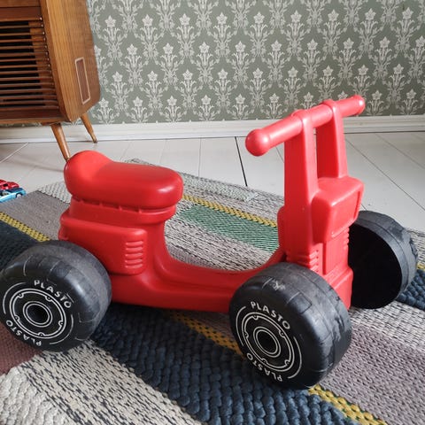 Plasto potkuauto lapsille. Materiaalina kestävä muovi ja värinä musta. Nelipyöräinen malli, jossa leveät renkaat ja ohjaustanko, sopii sisä- ja ulkoleikkeihin tasaisella alustalla. Soveltuu potkutteluun ja motoristen taitojen harjoitteluun pienille lapsille aikuisen valvonnassa.